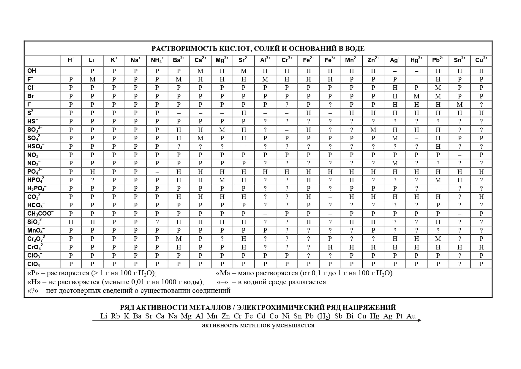 Таблицей растворимости солей, кислот и оснований в воде, электрохимическим рядом напряжений металлов;